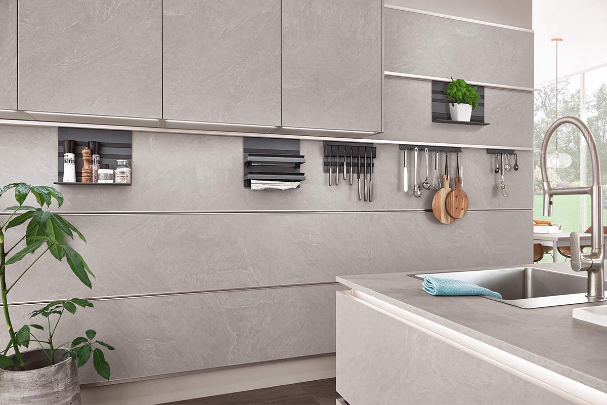Σαφής αρχιτεκτονική σε πέτρινη γκρι πλάκα. Ο σχεδιασμός Stone – Art συμπληρώνει την τάση προς τις πέτρινες διακοσμήσεις μεγάλου μεγέθους με εξαιρετική φυσική εμφάνιση. Μια μοντέρνα κουζίναμε ακαταμάχητο σχεδιασμό και εργονομικότητα.
