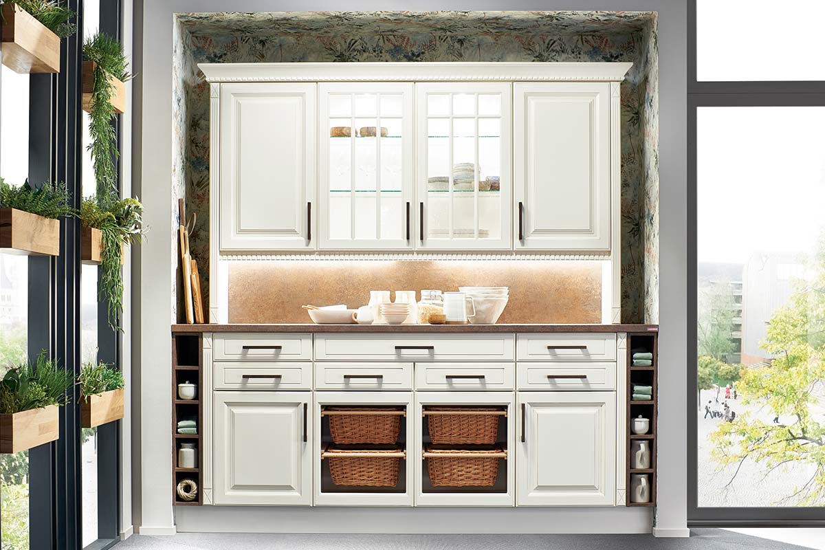Κομψότητα με κλασική πινελιά! Χαρακτηριστικό αυτής της σύγχρονης κουζίνας εξοχικού σπιτιού είναι οι όμορφς διακοσμητικές λεπτομέρειες και τα γυάλινα πόρτάκια. Μαζί με το γείσο και το ελαφρύ προφίλ δίνουν σε αυτήν την κουζίνα μια μεσογειακή αίσθηση.