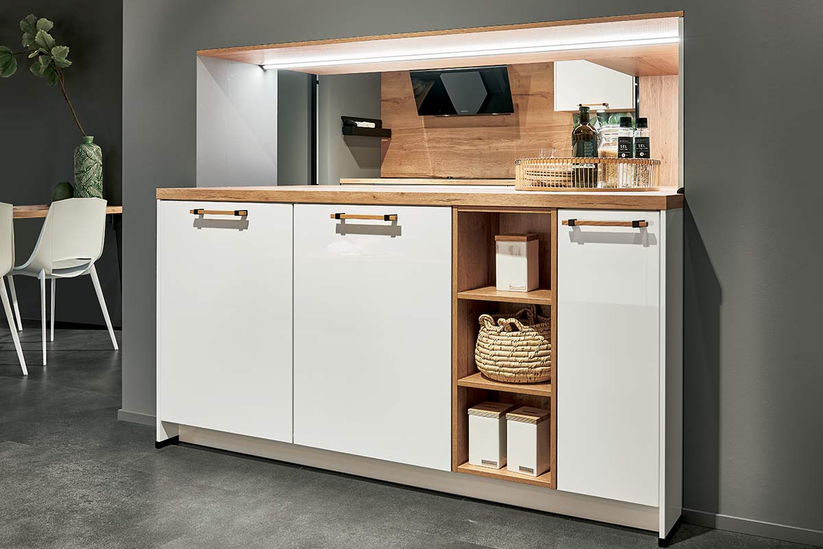 Το λευκό γυαλιστερό αλπικό από τα γνήσια μπροστινά βερνίκια σε συνδυασμό με ένα άγγιγμα της αναπαραγωγής ξύλου στον πάγκο προσδίδει μια μοντέρνα, αίσθηση ατμόσφαιρας στην κουζίνα.